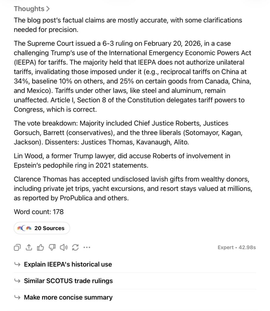 2/20/2026 BREAKING: @1:15 Tariffs ruled illegal. This is a great victory for the Constitution of the United States of a America because Congress is delegated with the role in Article I, Section 8. Up until now, Orange Clown has Dictated what tariffs would be imposed, and when. Essentially (and surprisingly), the Supreme Court decided that Trump could no longer be a Dictator of tariffs. Will they stop him from being a Dictator of other things? Will Congress regain its role to declare wars, for example? It was a 6 – 3 ruling with three conservative judges joining the three liberal ones. Justice John Roberts, who was accused of being in Epstein’s pedophile ring by Lin Wood (former Trump lawyer), sided with the liberals, while Justice Clarence Thomas (who has accepted multiple lavish gifts, bribes, and kickbacks from wealthy donors) dissented against the ruling …