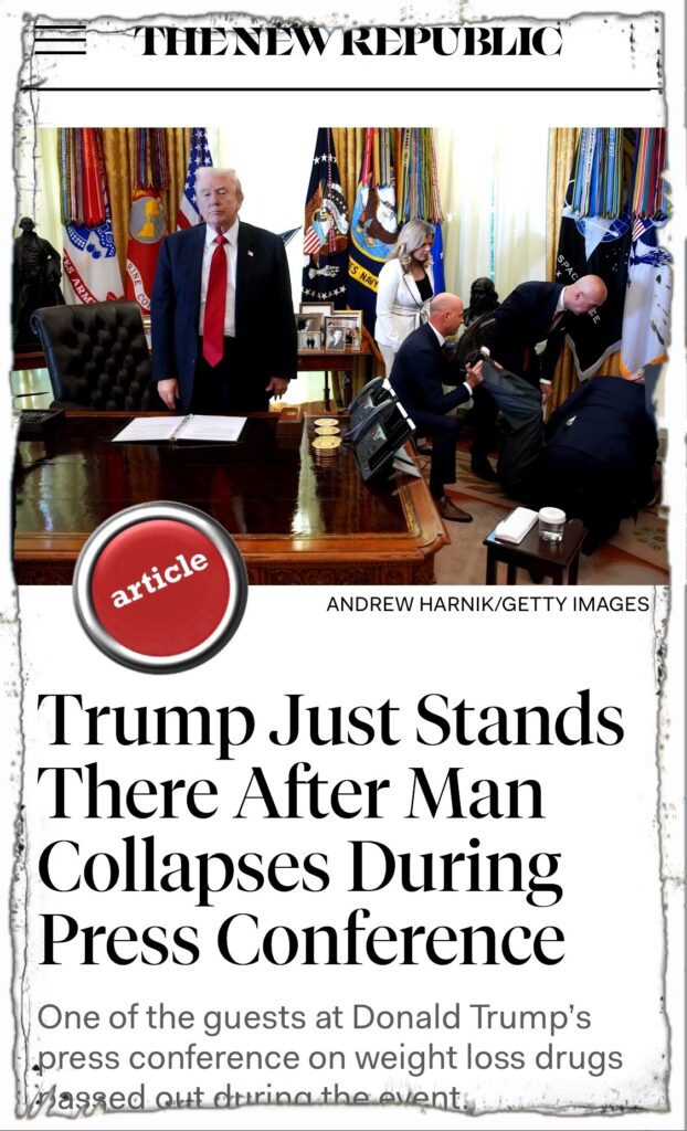 11/6/2025 A man collapsed in the Oval Office during a press conference, and Orange Clown stood thete, lost in a daze. Instead of being concerned, he appeared perturbed that his propaganda event was interrupted …