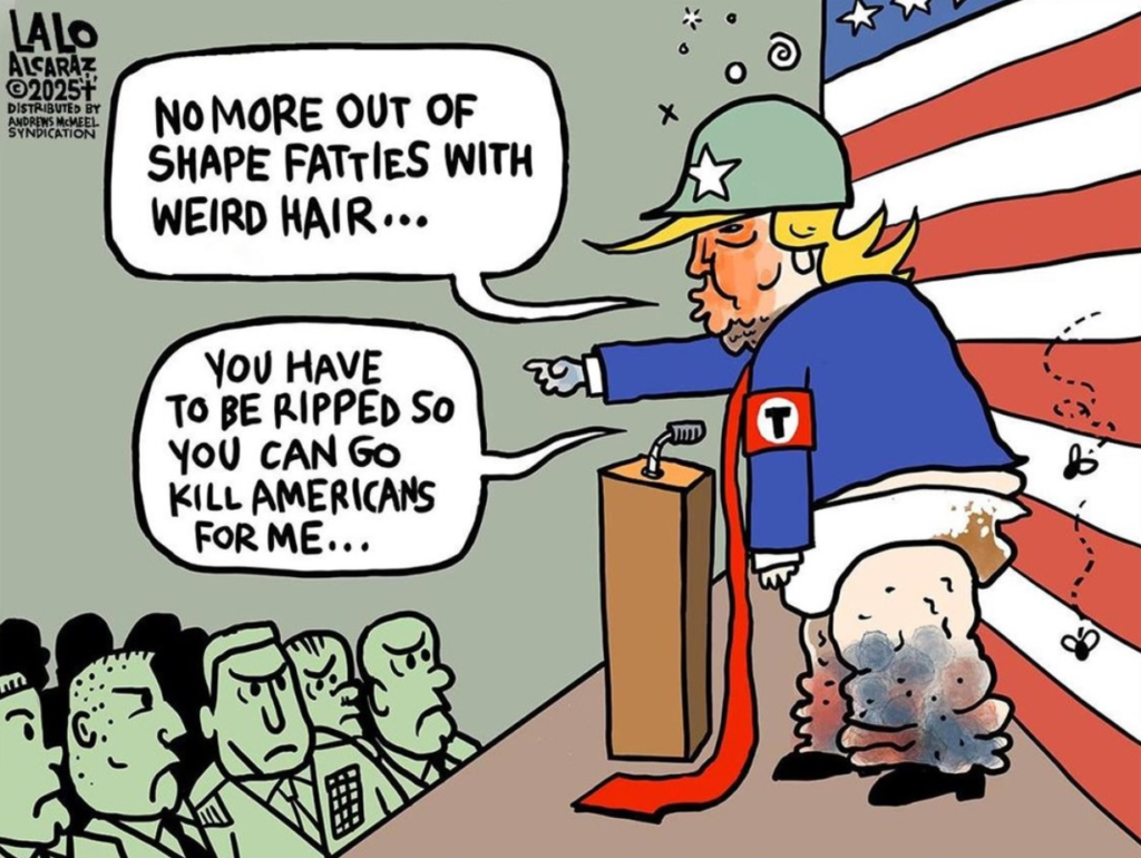 10/15/2025 A classic move of Fascists is to demonize and limit the Free Press. Orange Clown and his Drunk Goon are attempting that with the American media. They put an ultimatum on the major networks and publications to sign an agreement by today which would curtail their expression of news coming from the Pentegon. All refused to sign and put out a joint statement. There was one, single exception, OAN. Reno, Nevada has a motto. They call themselves the “Biggest Little City in the World”. That’s who OAN is. They barely qualify as a “major news source”, and this is their way of being talked about in the same sentence as CNN, MSNBC, and the New York Times. Even right-wing outlets, FoxNews and Newsmax, refused to sign the agreement. That ought to tell ya’ something. The cheese stands alone …
